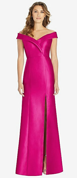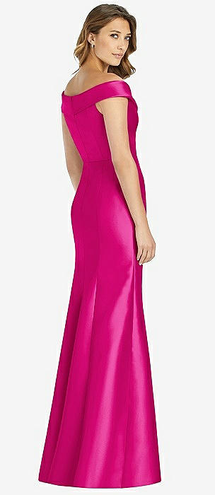 Off-the-Shoulder Cuff Trumpet Gown with Front Slit in think pink