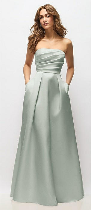 Strapless Hand-Pleated Bodice Satin Maxi Dress with Full Pleated Skirt in willow green