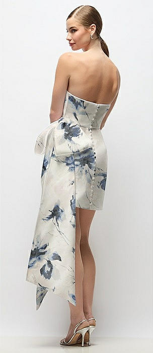 Strapless Pleated Draped Floral Satin Mini Dress with Dramatic Long Tail Bow & Covered Buttons in inkwash blue floral