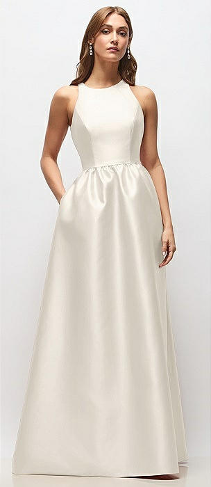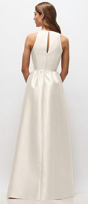 Jewel Neck Halter Full A-Line Satin Maxi Dress in ivory