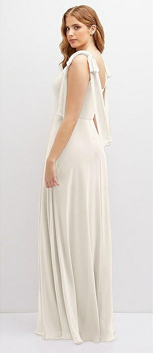 Bow-Shoulder V-Back Chiffon Gown with Front Slit in ivory