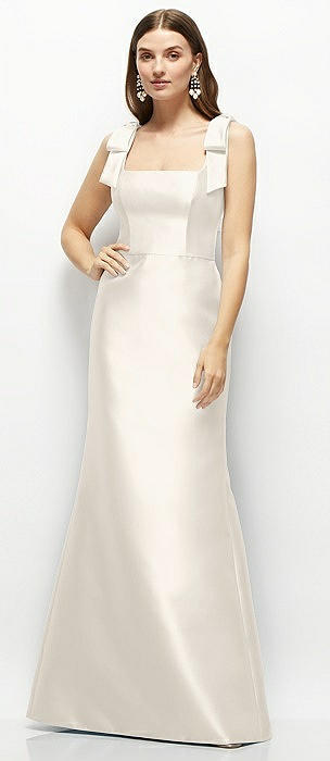 Satin Fit and Flare Maxi Dress with Shoulder Bows in ivory