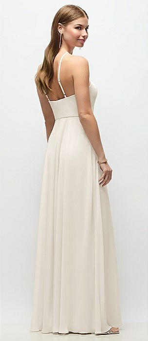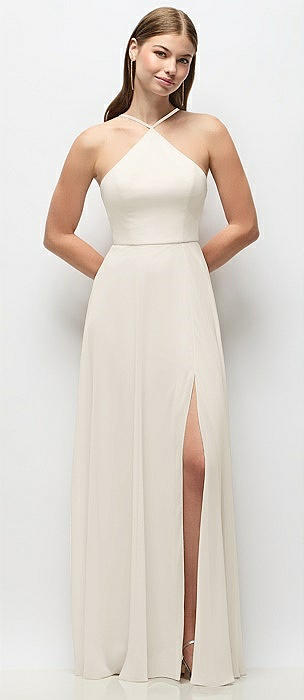 High-Neck Halter Chiffon Maxi Dress with Adjustable Spaghetti Straps in ivory