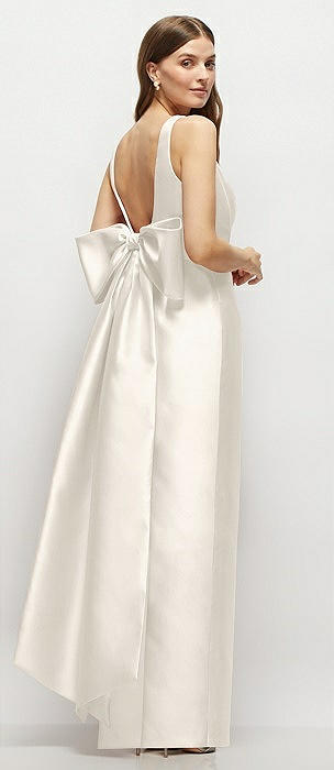 Deep V-back Satin Trumpet Dress with Cascading Bow at One Shoulder in ivory