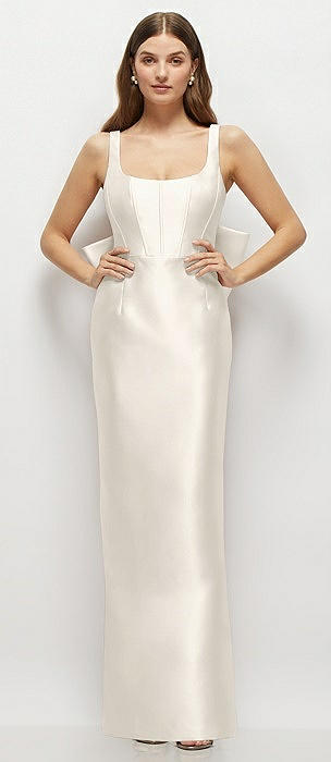 Scoop Neck Corset Satin Maxi Dress with Floor-Length Bow Tails in ivory