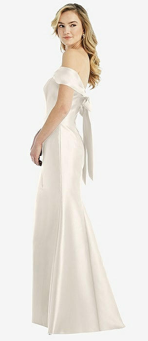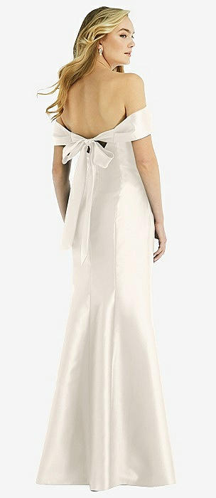 Off-the-Shoulder Bow-Back Satin Trumpet Gown in ivory
