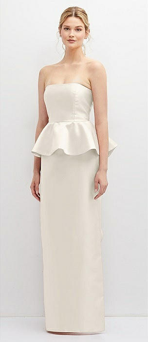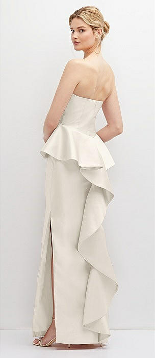 Strapless Satin Maxi Dress with Cascade Ruffle Peplum Detail in ivory