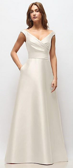Asymmetrical Bow Off-Shoulder Satin Gown with Ballroom Skirt in ivory