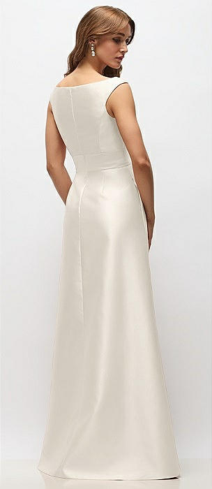 Basque-Neck Satin Column Maxi Dress with Off-the-Shoulder Bows in ivory