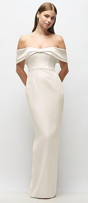 Off-the-Shoulder Crepe Column Maxi Dress with Bow-Pinch Detail in ivory