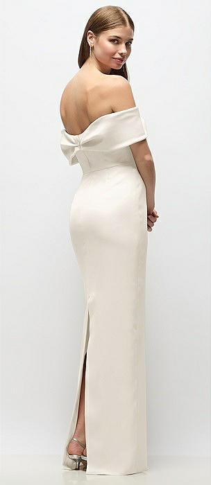 Off-the-Shoulder Bow-Back Satin Trumpet Gown in ivory
