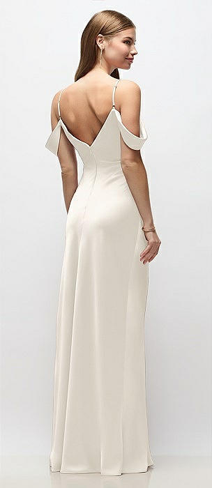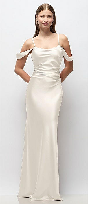 Off-the-Shoulder Swag Ruched Side Satin Bias Maxi Dress with Adjustable Spaghetti Straps in ivory