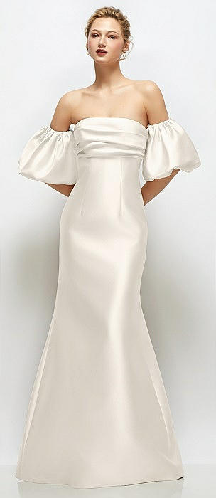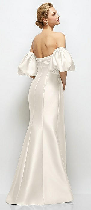 Off-the-Shoulder Puff Sleeve Satin Maxi Dress with Flared Skirt in ivory