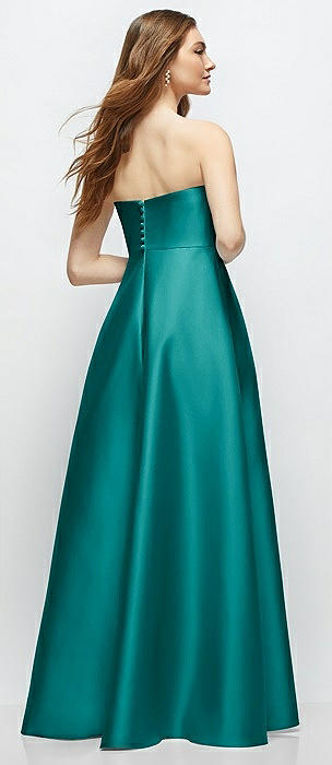 Strapless Satin Gown with Full Skirt and Covered Buttons at Back in jade