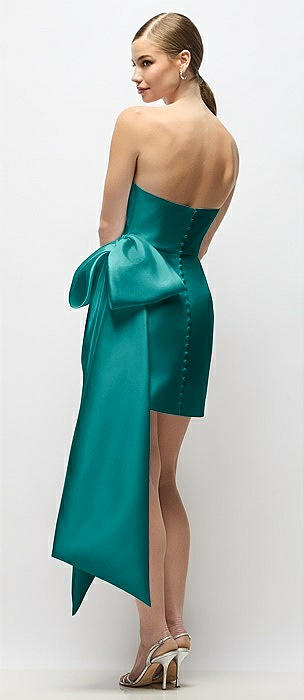 Strapless Pleated Draped Satin Mini Dress with Dramatic Long Tail Bow & Covered Buttons in jade