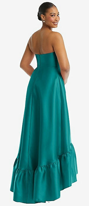 Strapless Deep Ruffle Hem Satin High Low Dress with Pockets in jade