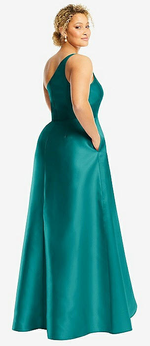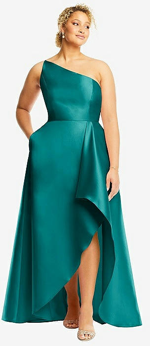 One-Shoulder Satin Gown with Draped Front Slit and Pockets in jade