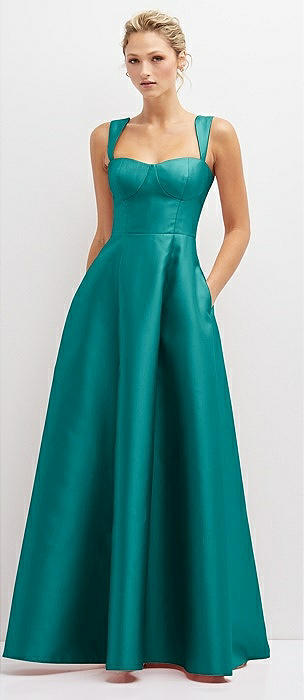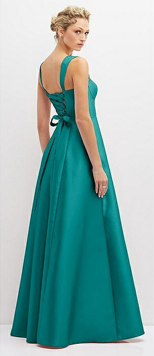 Lace-Up Back Bustier Satin Dress with Full Skirt and Pockets in jade