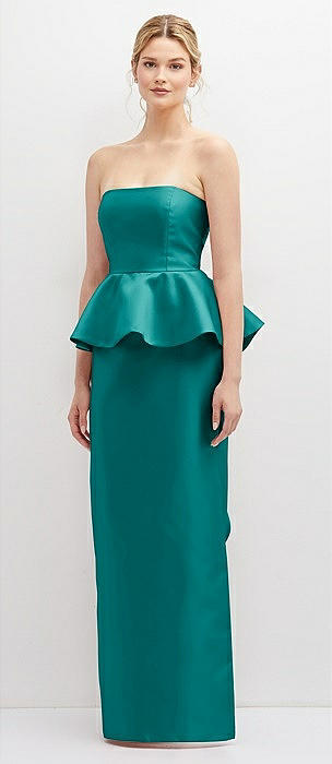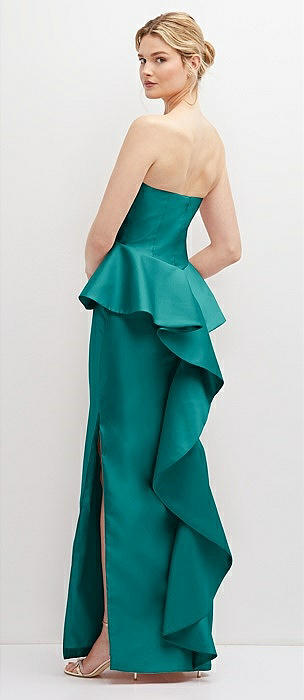 Strapless Satin Maxi Dress with Cascade Ruffle Peplum Detail in jade