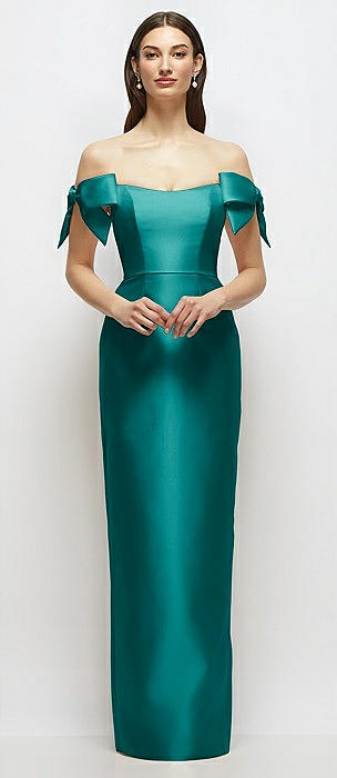 Basque-Neck Satin Column Maxi Dress with Off-the-Shoulder Bows in jade