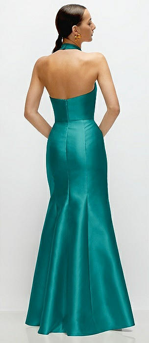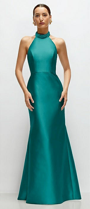 High-Neck Halter Open-Back Satin Trumpet Dress in jade
