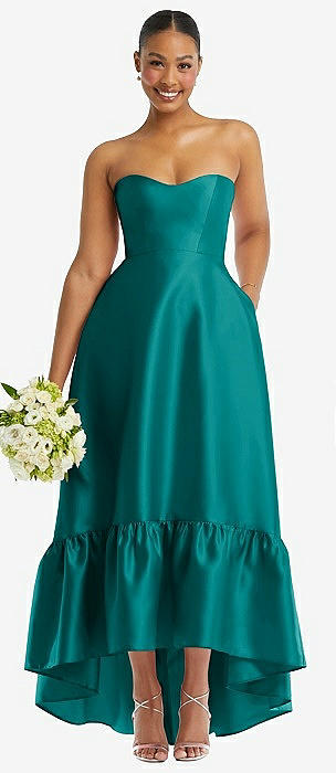 Strapless Deep Ruffle Hem Satin High Low Dress with Pockets in jade