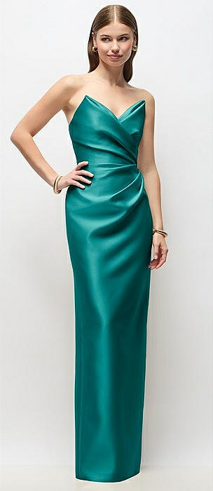 Strapless Asymmetrical Draped Satin Column Maxi Dress in jade
