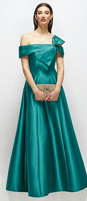 Asymmetrical Bow Off-Shoulder Satin Gown with Ballroom Skirt in jade
