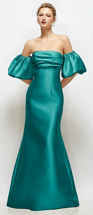 Off-the-Shoulder Puff Sleeve Satin Maxi Dress with Flared Skirt in jade