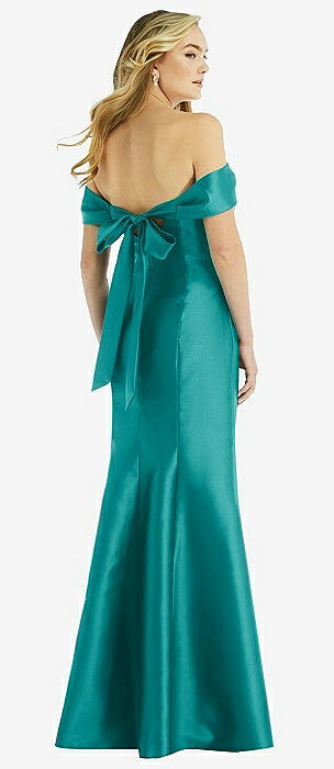 Off-the-Shoulder Bow-Back Satin Trumpet Gown in jade