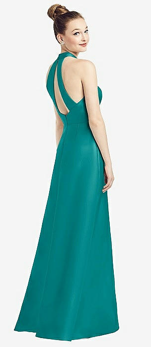 High-Neck Halter Open-Back Satin Trumpet Dress in jade