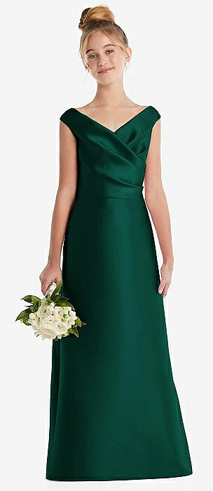 Off-the-Shoulder Draped Wrap Satin Junior Bridesmaid Dress in hunter green