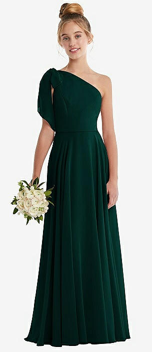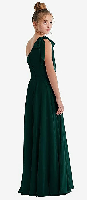 One-Shoulder Scarf Bow Chiffon Junior Bridesmaid Dress in evergreen
