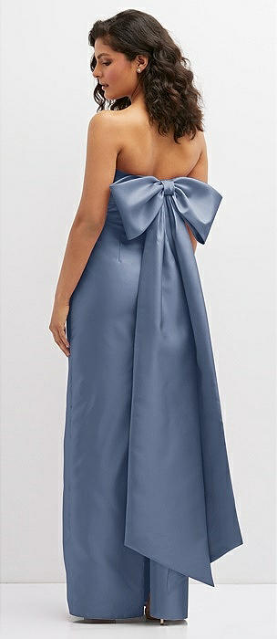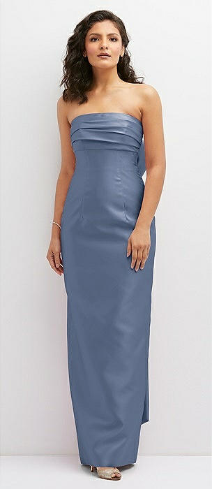 Strapless Draped Bodice Column Dress with Oversized Bow in larkspur blue