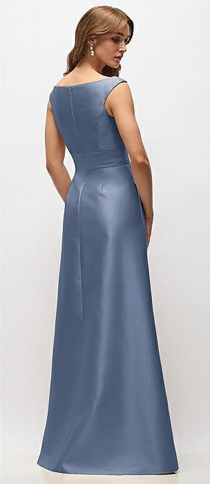 Basque-Neck Strapless Satin Gown with Mini Sash in larkspur blue