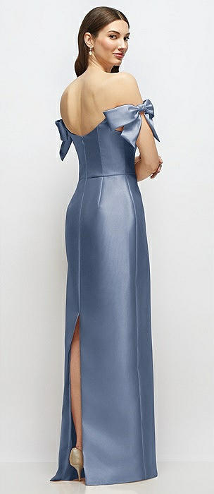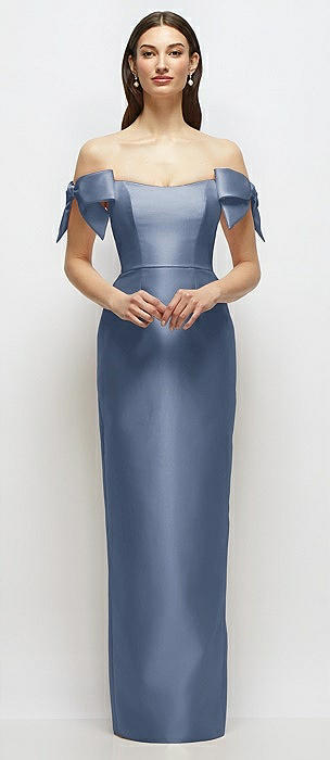 Basque-Neck Satin Column Maxi Dress with Off-the-Shoulder Bows in larkspur blue