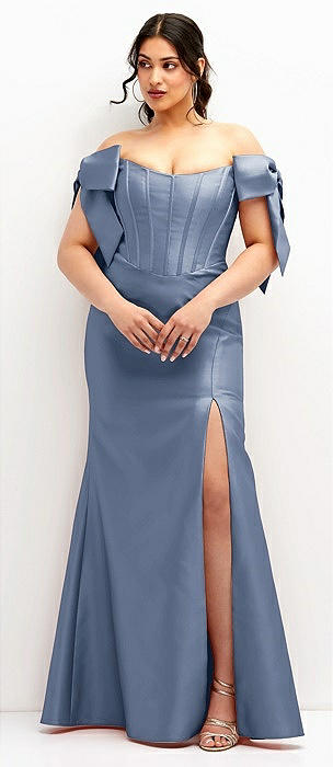 Off-the-Shoulder Bow Satin Corset Dress with Fit and Flare Skirt in larkspur blue