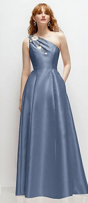 One-Shoulder Full A-Line Satin Gown with Handworked Floral Appliqué in larkspur blue