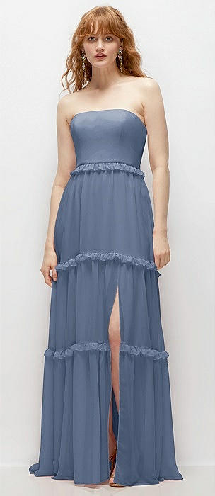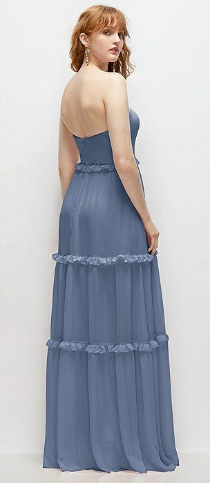 Strapless Chiffon Maxi Dress with Tiered Micro Ruffle Full Skirt in larkspur blue