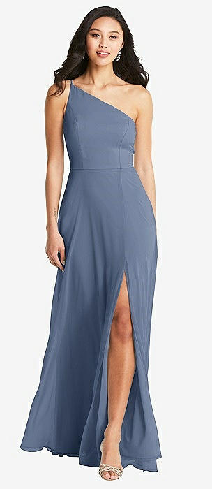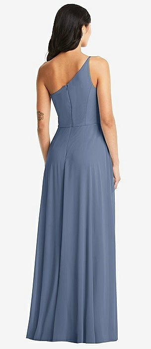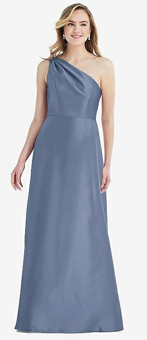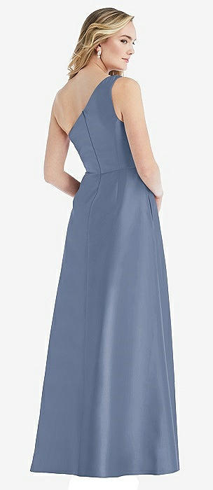 One-Shoulder Satin Gown with Draped Front Slit and Pockets in larkspur blue