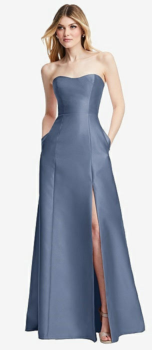 Strapless Satin Gown with Draped Front Slit and Pockets in larkspur blue