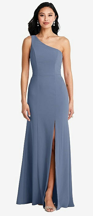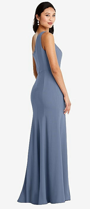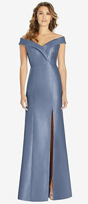 Off-the-Shoulder Cuff Trumpet Gown with Front Slit in larkspur blue