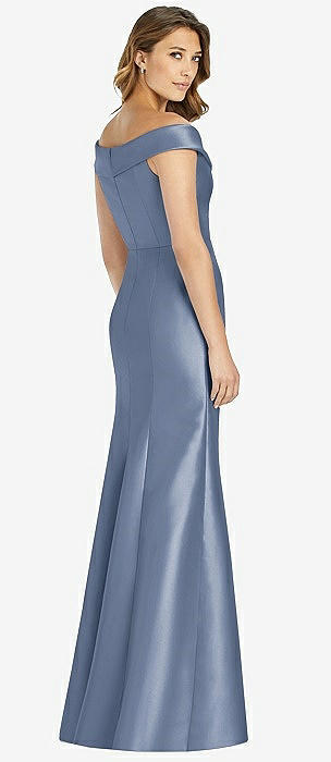 Off-the-Shoulder Bow-Back Satin Trumpet Gown in larkspur blue