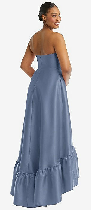 Strapless Deep Ruffle Hem Satin High Low Dress with Pockets in larkspur blue