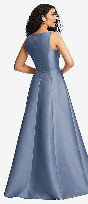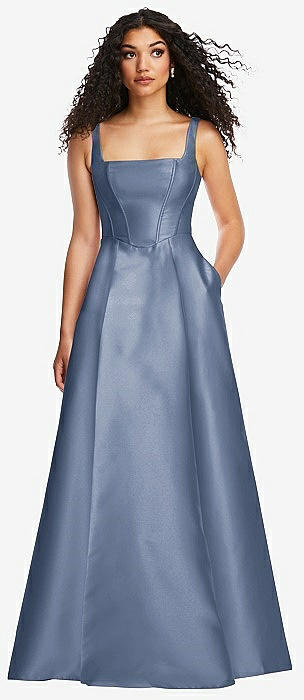 Boned Corset Closed-Back Satin Gown with Full Skirt and Pockets in larkspur blue