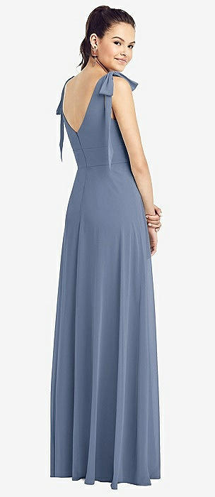 Bow-Shoulder V-Back Chiffon Gown with Front Slit in larkspur blue