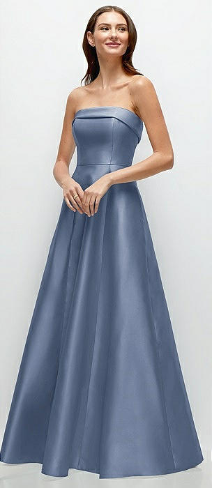 Strapless Bias Cuff Bodice Satin Gown with Pockets in larkspur blue