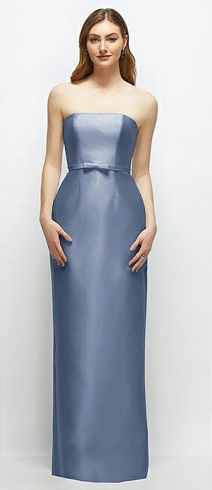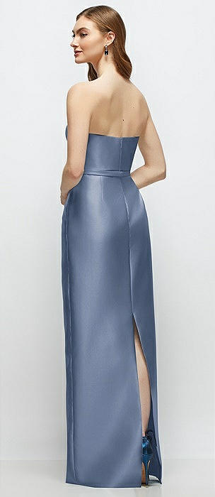 Strapless Satin Column Dress with Back Slit in larkspur blue