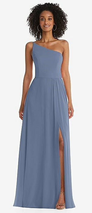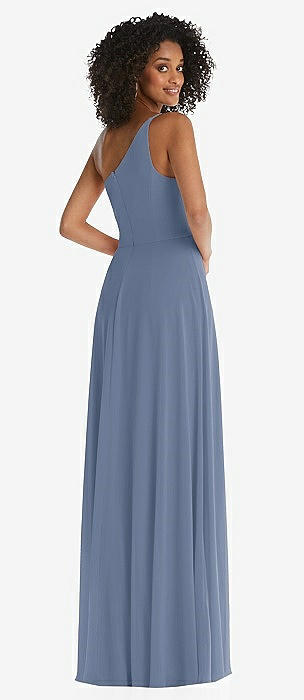 One-Shoulder Chiffon Maxi Dress with Shirred Front Slit in larkspur blue