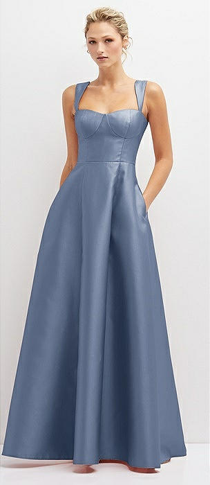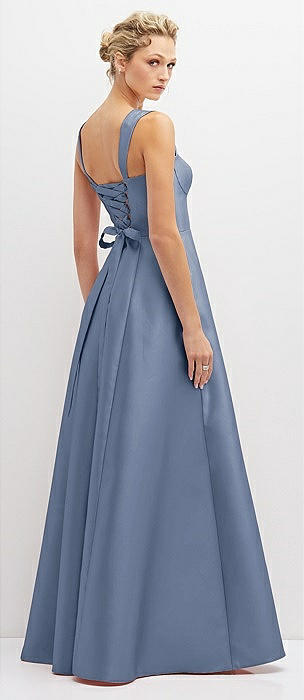 Lace-Up Back Bustier Satin Dress with Full Skirt and Pockets in larkspur blue